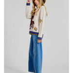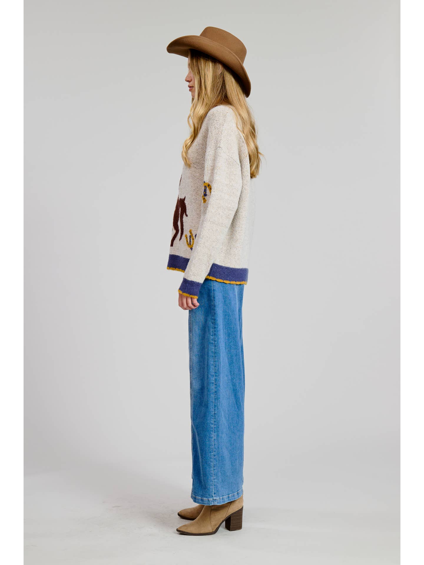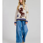 Of Course!  It's a horse, on an amazing graphic sweater by Flat White. The whimsical woven motif features horseshoes, cacti, and a stylized rearing horse for some Yee-haw inspired fun. Wear this western, with boots and a denim skirt, or buy it as your Montana souvenir.  Flat White  is a Moka favorite brand, and we can't get enough of their adorable graphic sweaters!