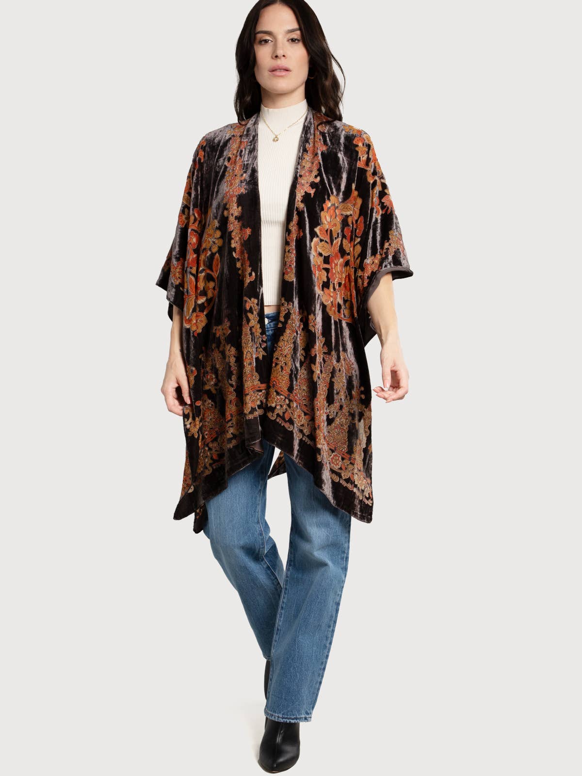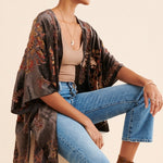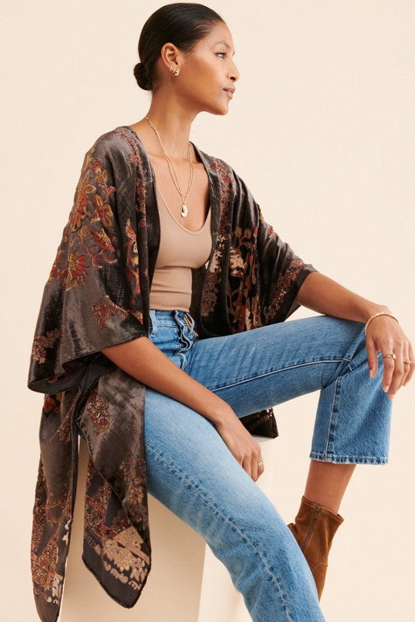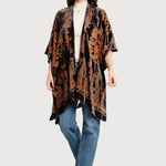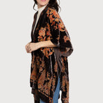 Elevate your look with our Floral Black Velvet Kimono. Featuring subtle orange and yellow florals on a black velvet background, it adds a touch of textured elegance that effortlessly flatters and drapes beautifully. Pair it with jeans or work attire for a refined and stylish look.