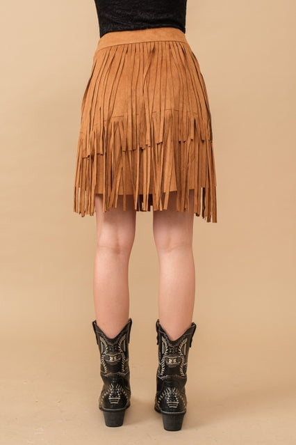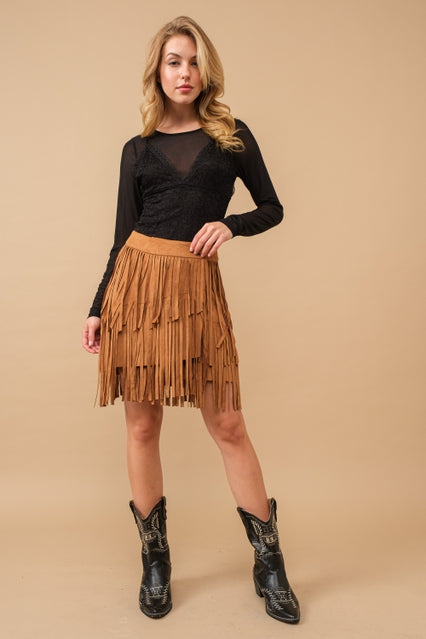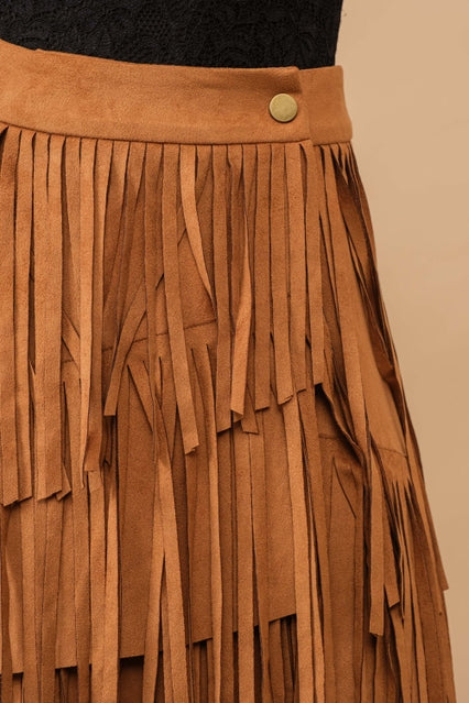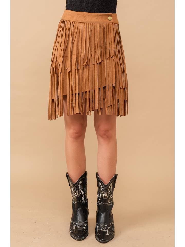 Channel effortless western vibes with this faux suede mini skirt, featuring playful fringe detailing for added movement and charm. Designed to sit comfortably at the waist, it's a standout piece that brings texture and edge to any outfit.
