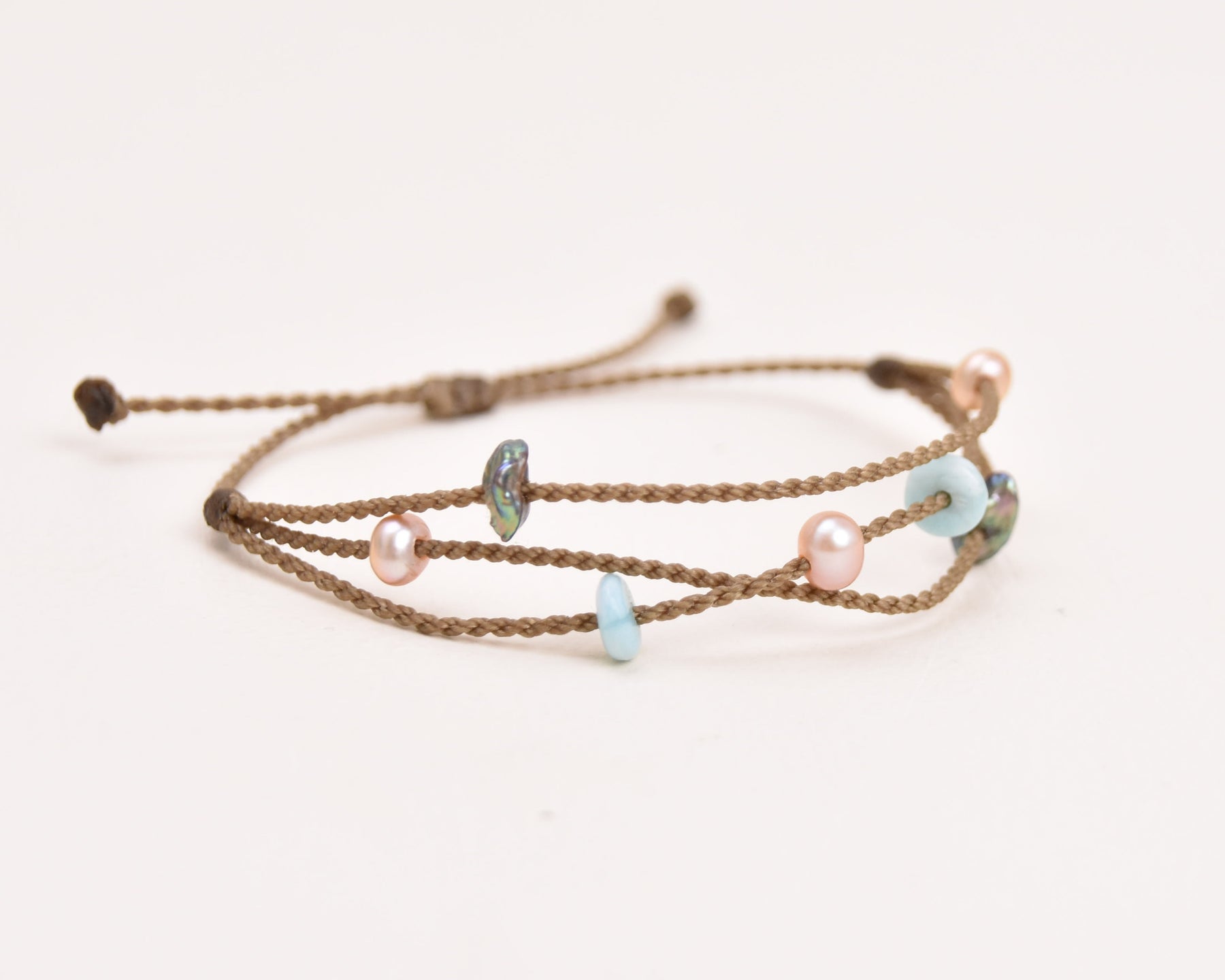 The Riptide bracelet - all the drama of a stack in just one perfect bracelet. Like all the Tula Blue jewelry, Riptide bracelets are completely waterproof, perfect for those summer days that take you from the beach to the pool and back again. (Beach and pool not necessary for carefree summer vibes!)- Freshwater Pearls, Keshi Pearls, and Larimar Stones