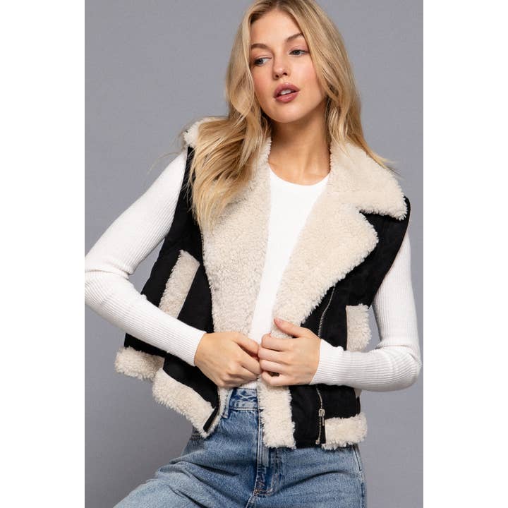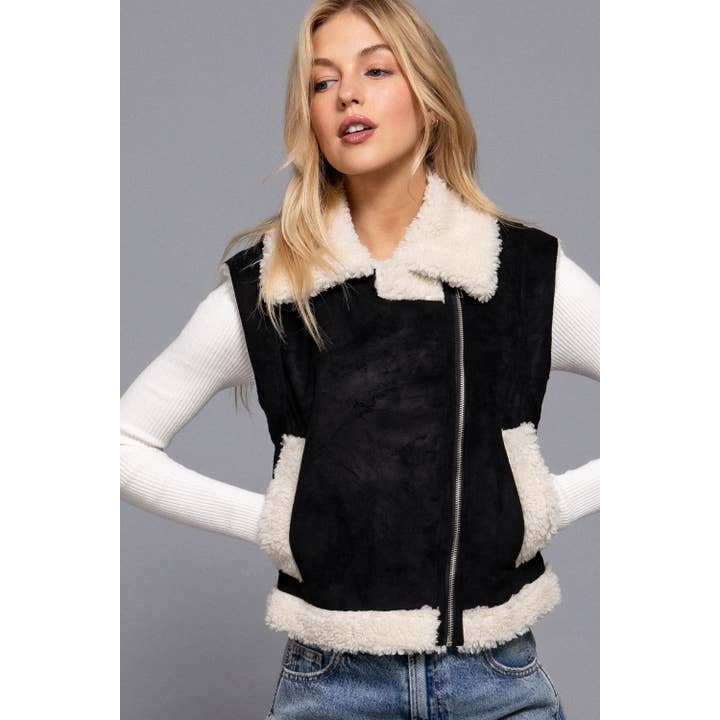 FAUX SUEDE INNER FUR ZIP UP VEST FABRIC: FAUX SUEDE FUR BONDED 100% POLYESTER