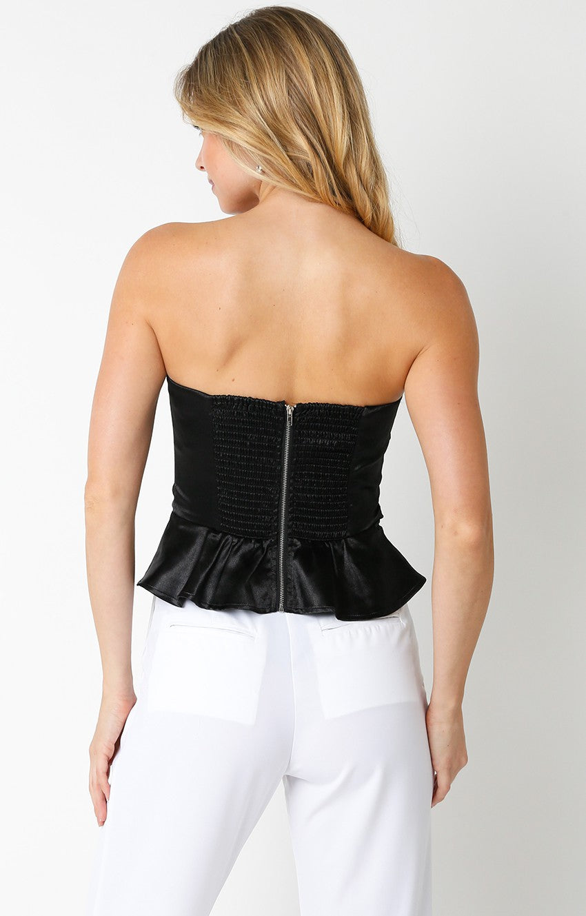 Going out? In Black or Champagne, this strapless top is perfect for a night on the town. The squared bust detail, side ruching and slight peplum make for an incredibly flattering silhouette. The smocked backing and touch of stretch provide a comfortable fit.