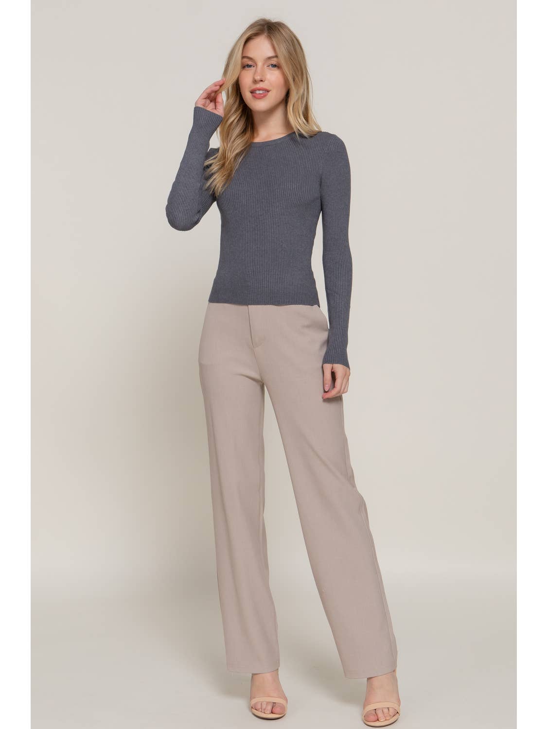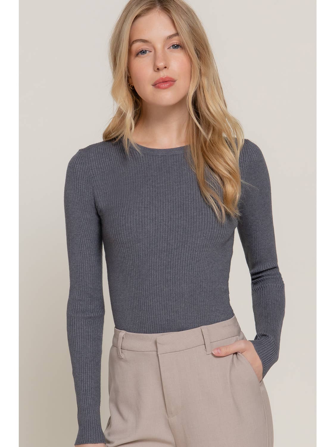 A great basic for fall with flattering ribbed texture and easy crew. neck style. Hits right at waist.