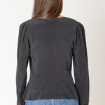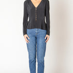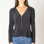 This flattering blouse can be dressed up or down, and can take you from work to a holiday party. The v-neckline, slight puff sleeve and covered button details add to the romantic silhouette of the peplum.