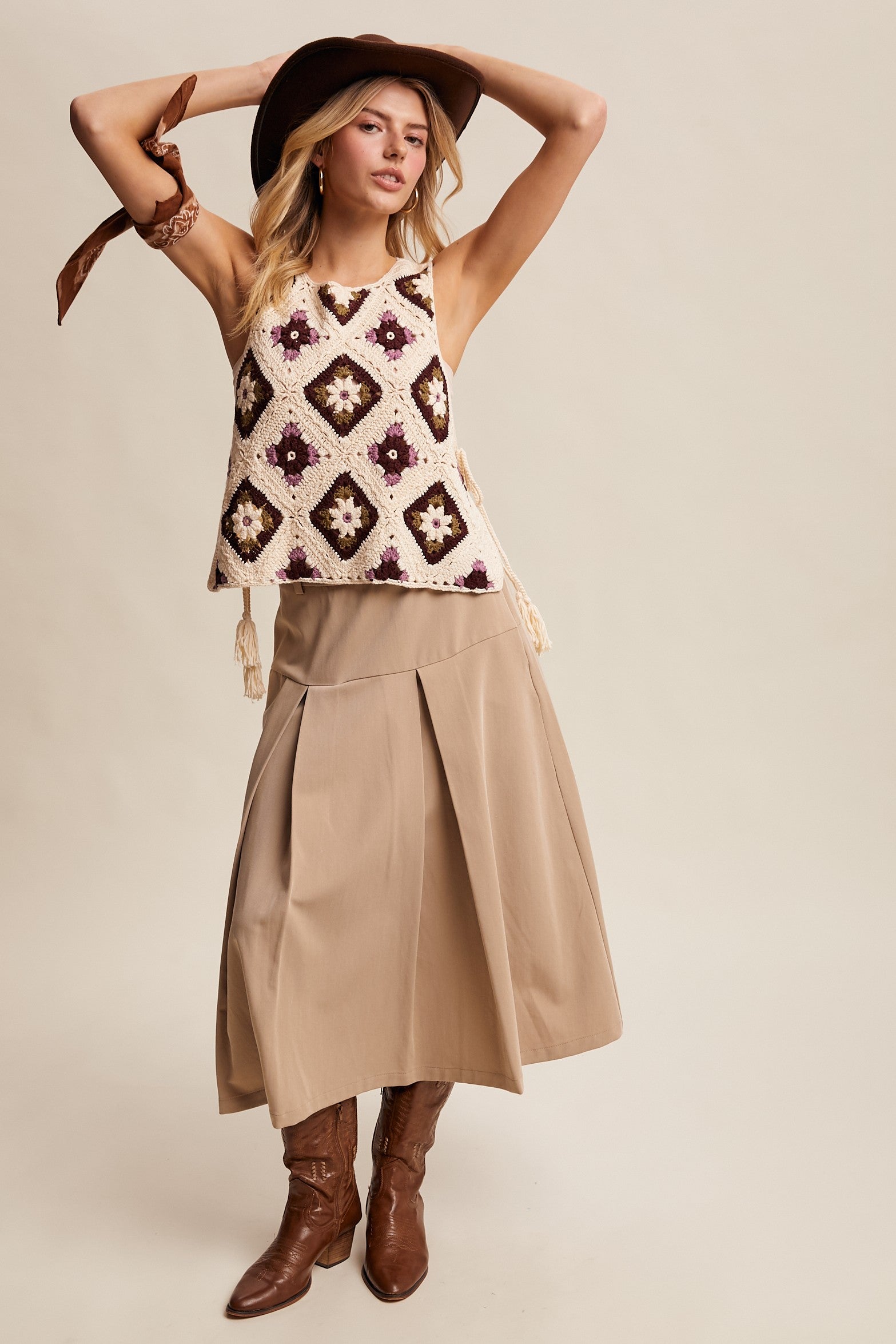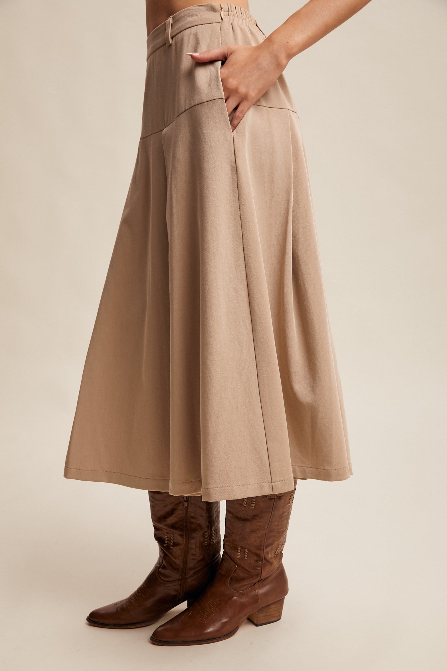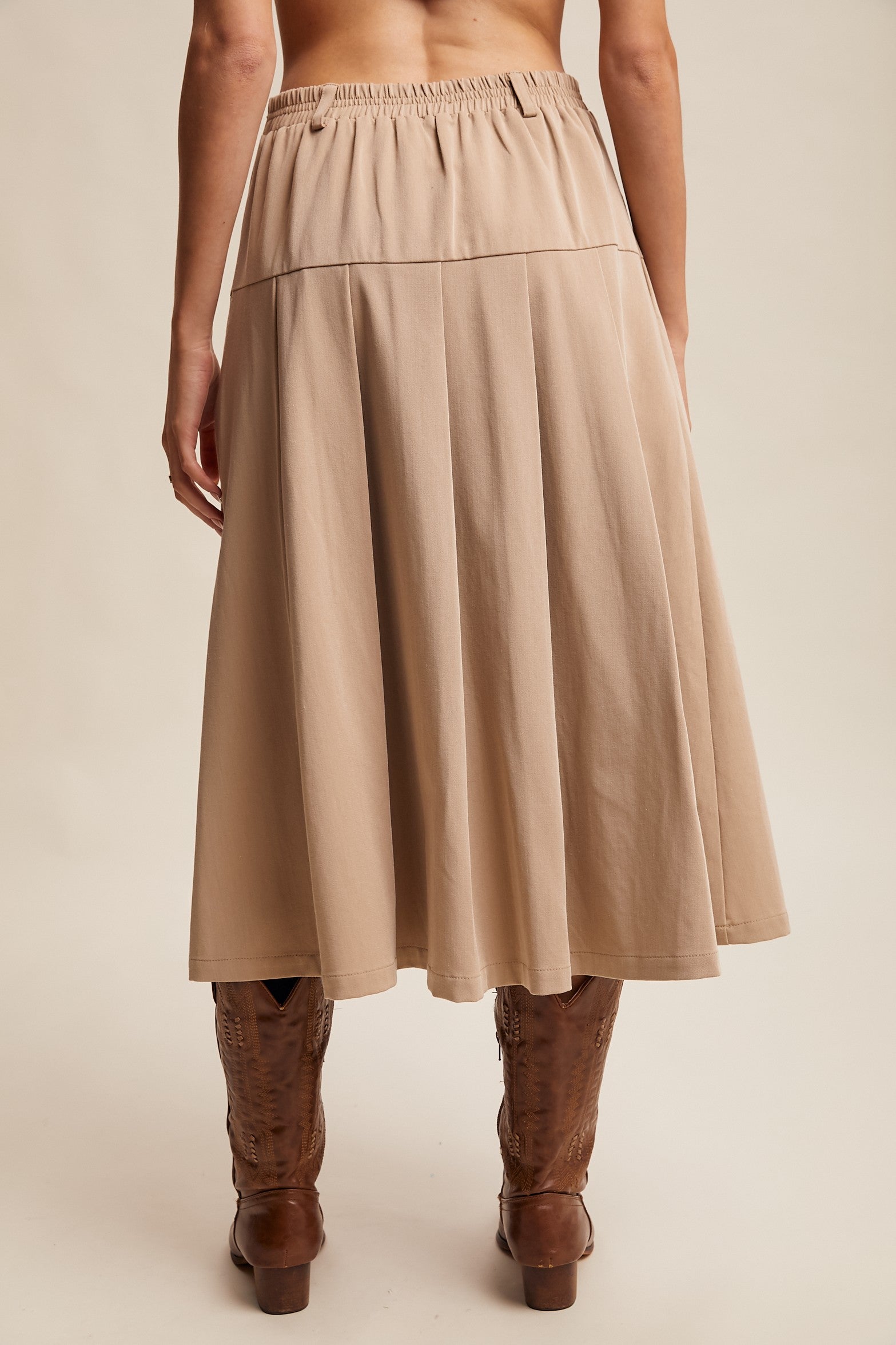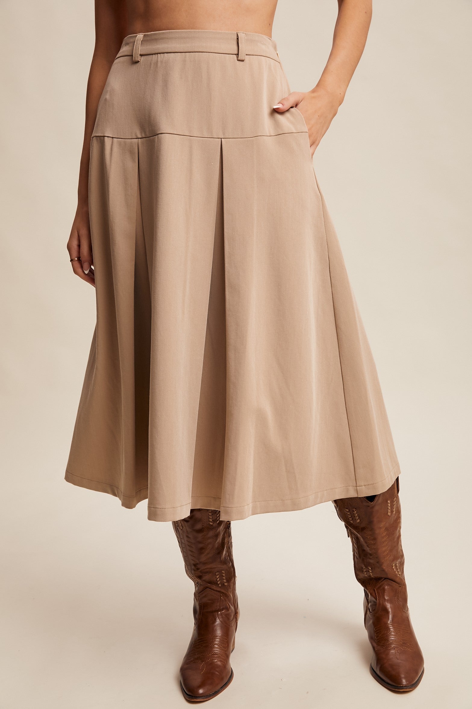 A refined take on everyday ease, this midi skirt balances clean tailoring with soft pleats. Whether paired with boots for a subtle Western edge or dressed down with sneakers, it's a versatile piece made to move with you.