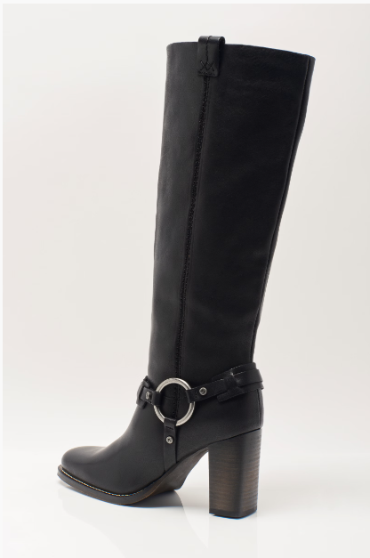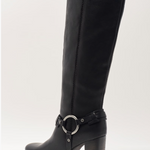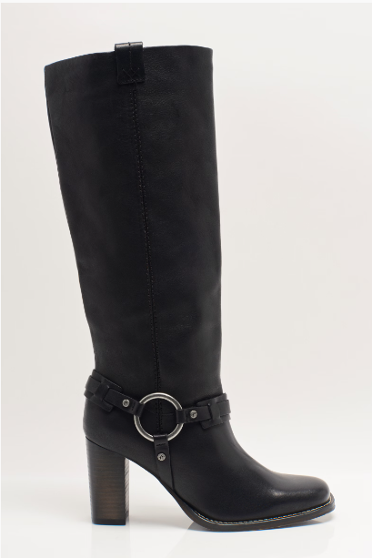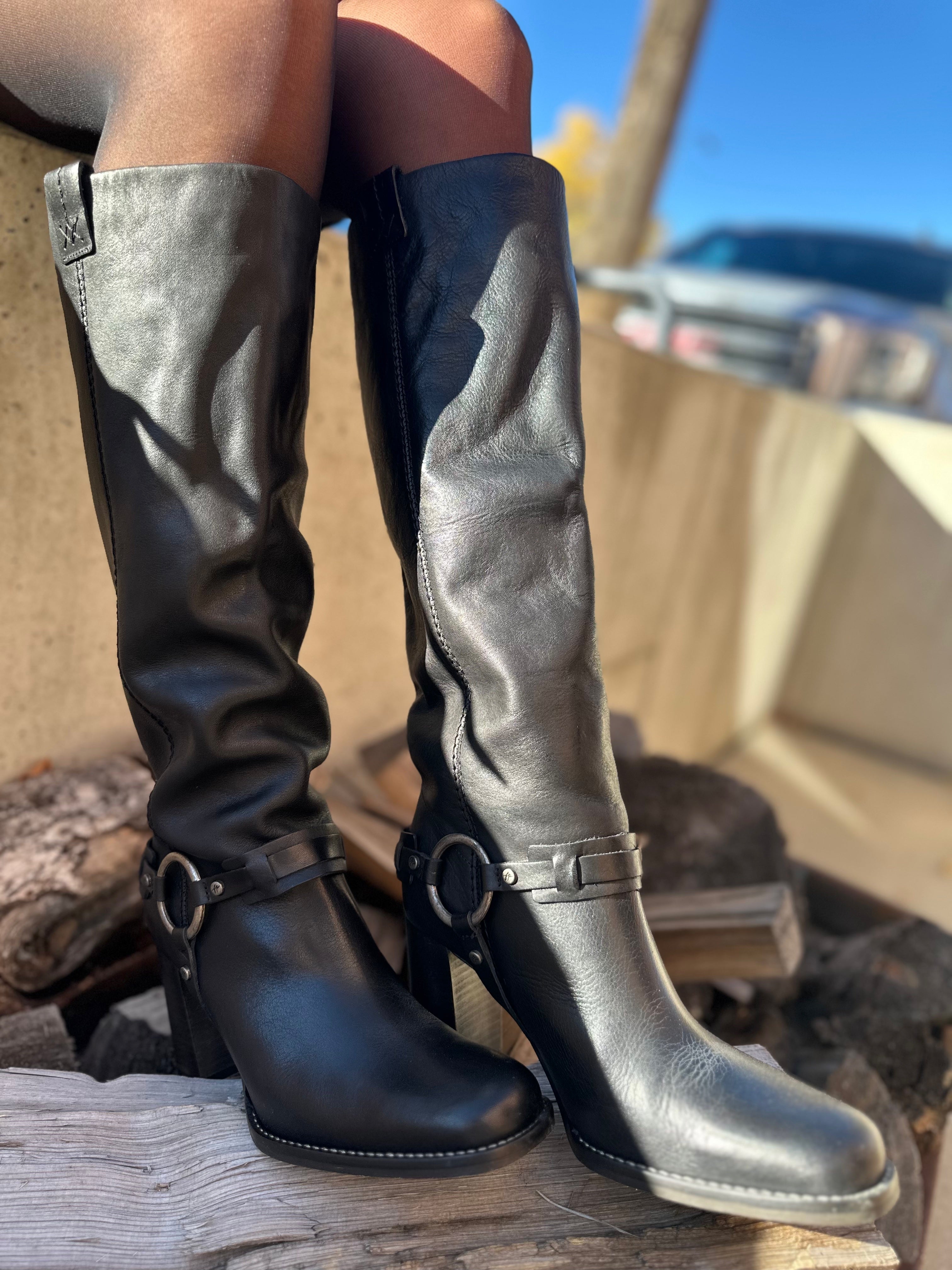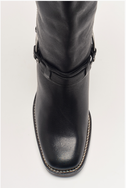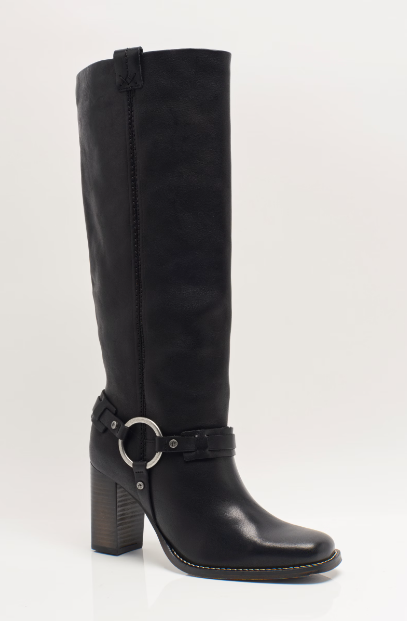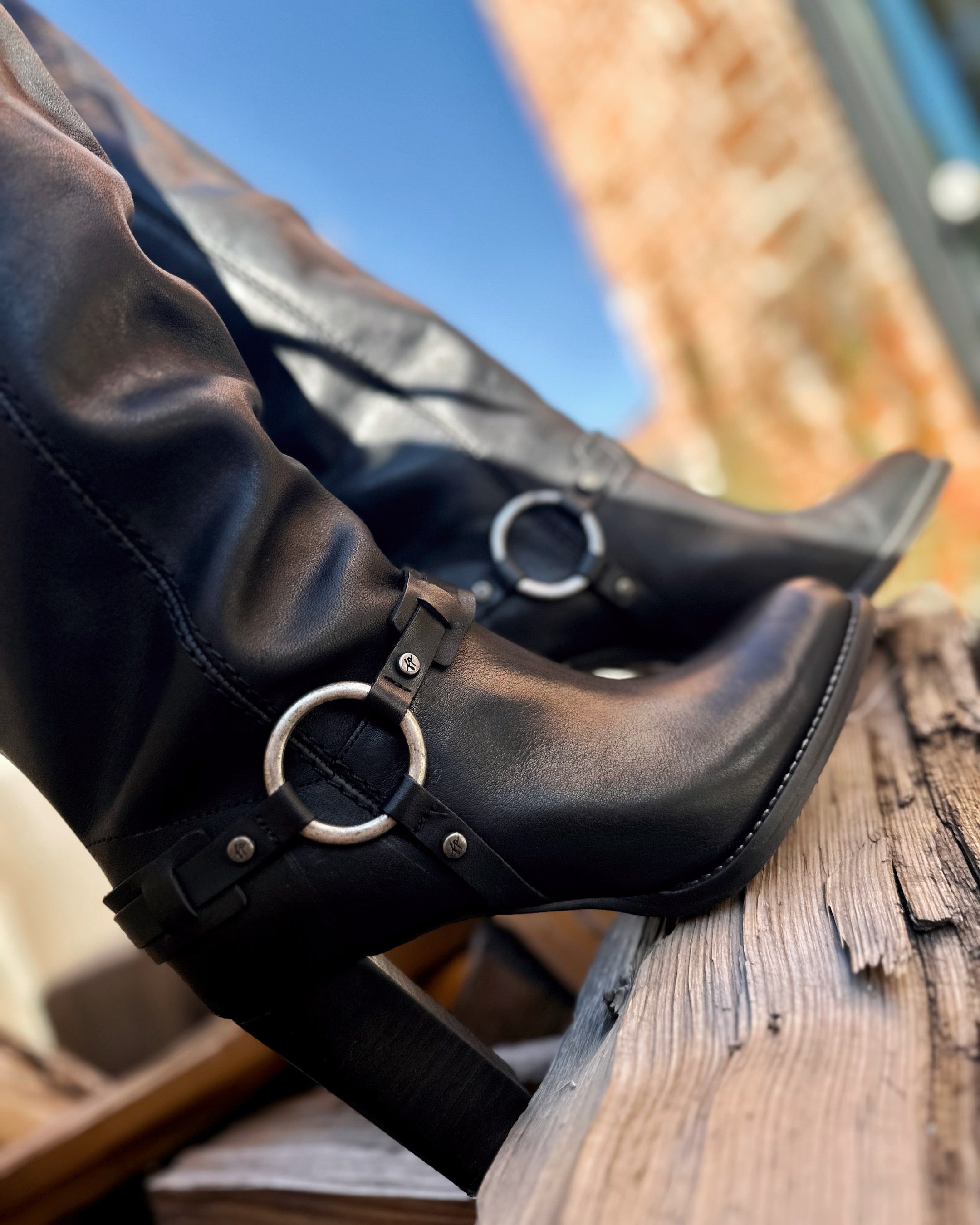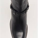 Add some edge to your 'fit in this classic boot by Free People. Smooth black leather and harness-style detailing with a silver ring nod to classic motorcycle style, updated with a beautiful tall stack heel. Wear it with everything in your wardrobe, from flowy lace skirts to micro mini shorts.