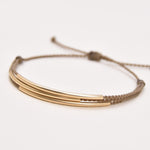Handmade waterproof 14k gold-filled rope bracelet with triple bar design and adjustable sliding knot closure. Minimalist metallic cord bracelet featuring signature hand-spun construction for subtle luxury stacking.