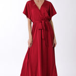 Gorgeous and flowing, with dolman sleeves, a flattering empire waist, and full length skirt with a split, this cranberry colored dress by Aakaa is ready for your holiday festivities. A self tie at the back neck and waist make this simple dress easy to adjust for the perfect fit.