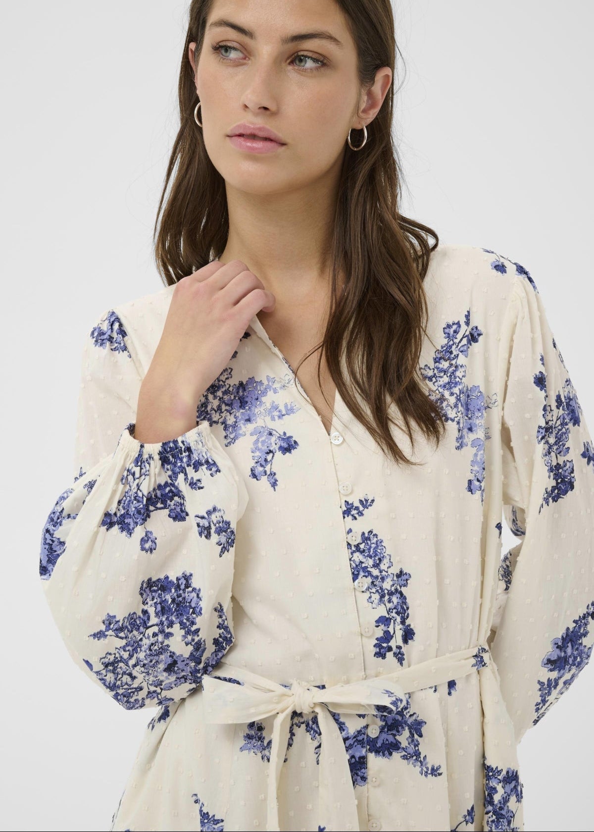 Graceful and light as a summer day, this simple cotton dress will have you sailing through spring in style. A self tie gathers the waist, but ensures that there is still plenty of movement in the full skirt. Romantic long sleeves and a button front just add to the lovely detailing. This dress is as at home at a farmer's market as it is at a more formal celebration, and will become a wardrobe staple!