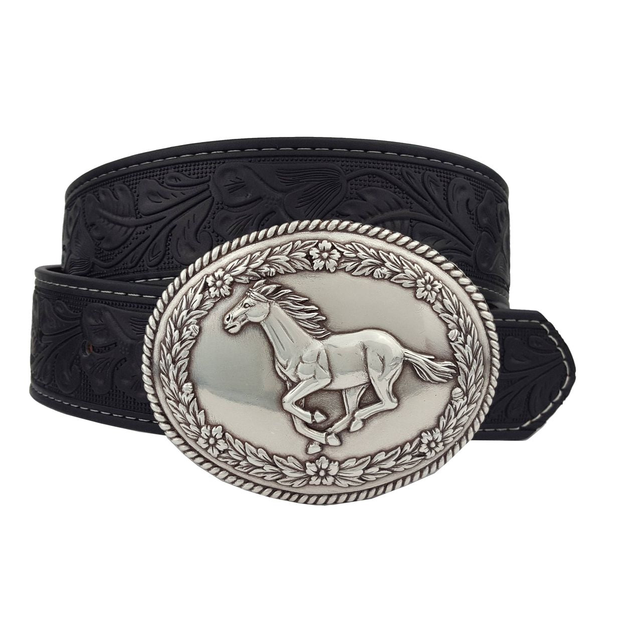 Axesoria West Women Accessories - Belts Silver Western Galloping Horse W. Floral Tooled Belt Ha0487-3877blks