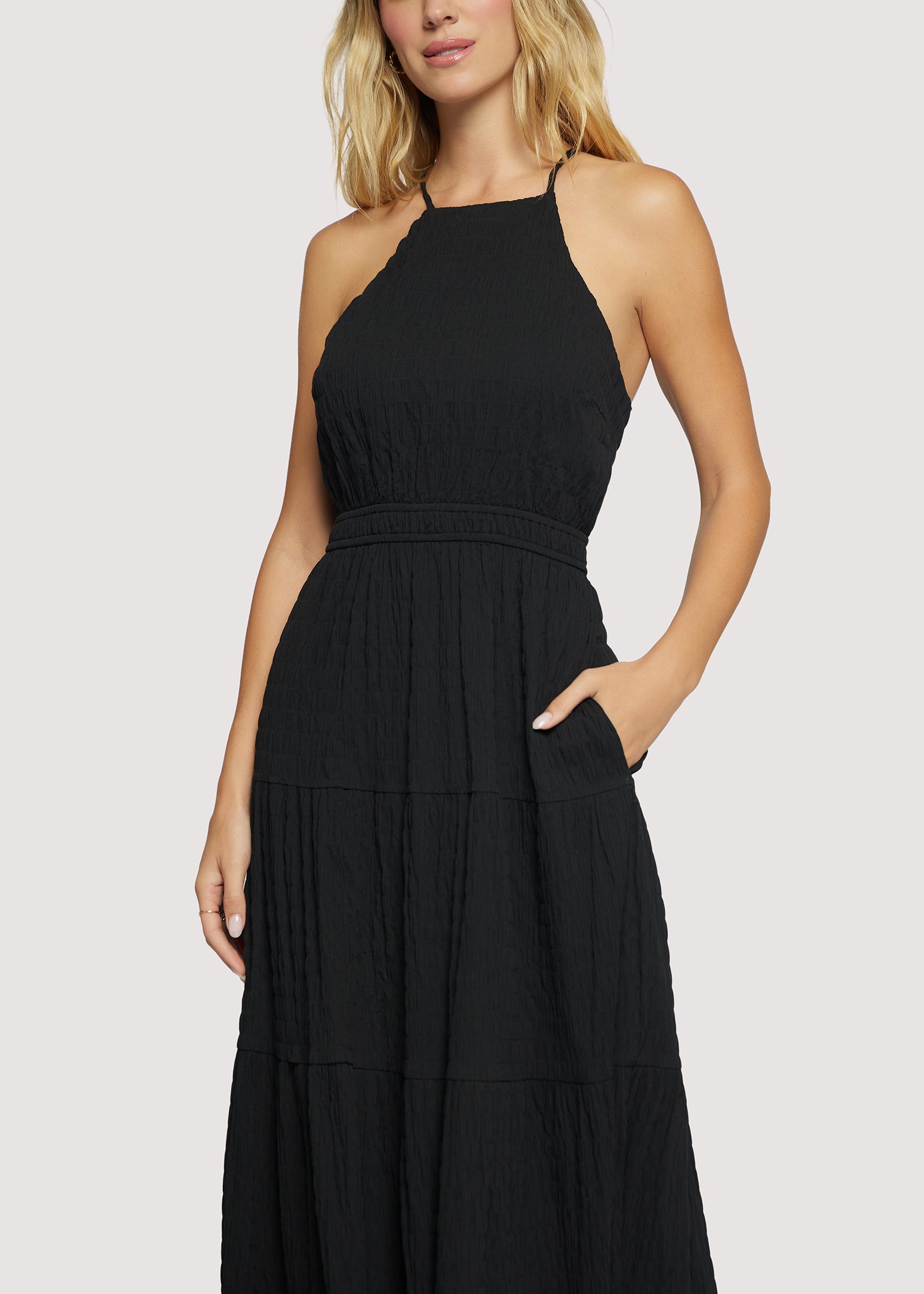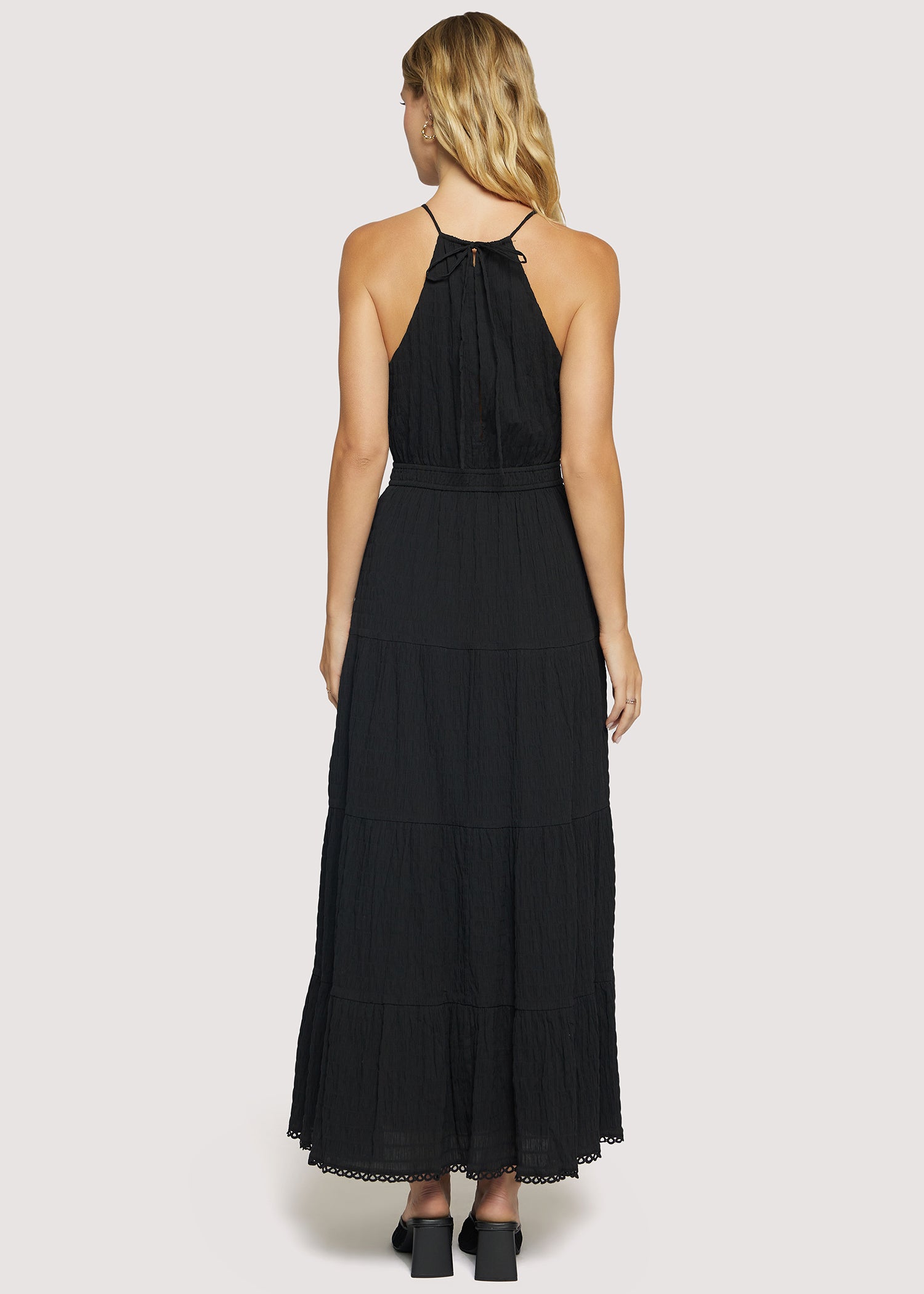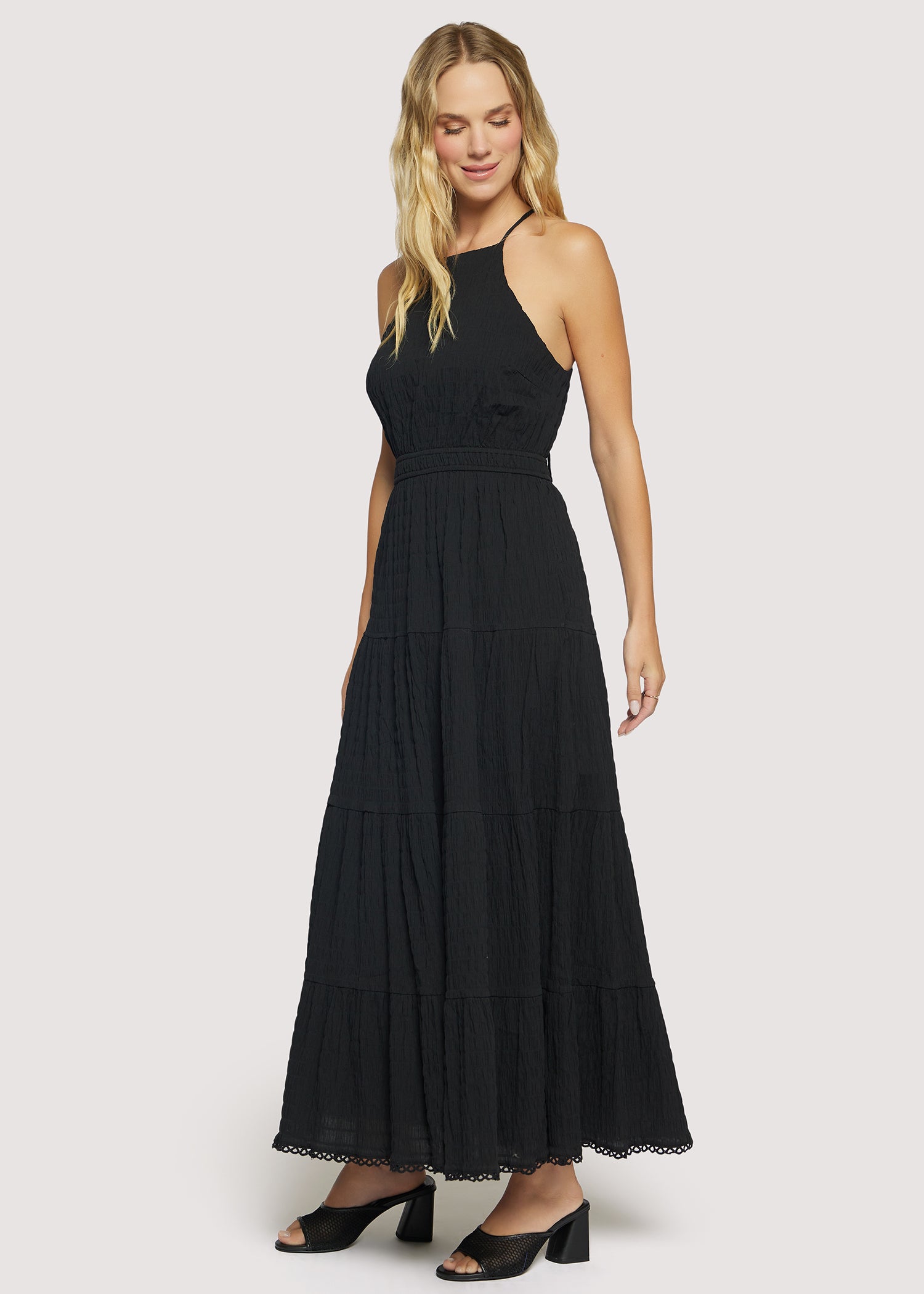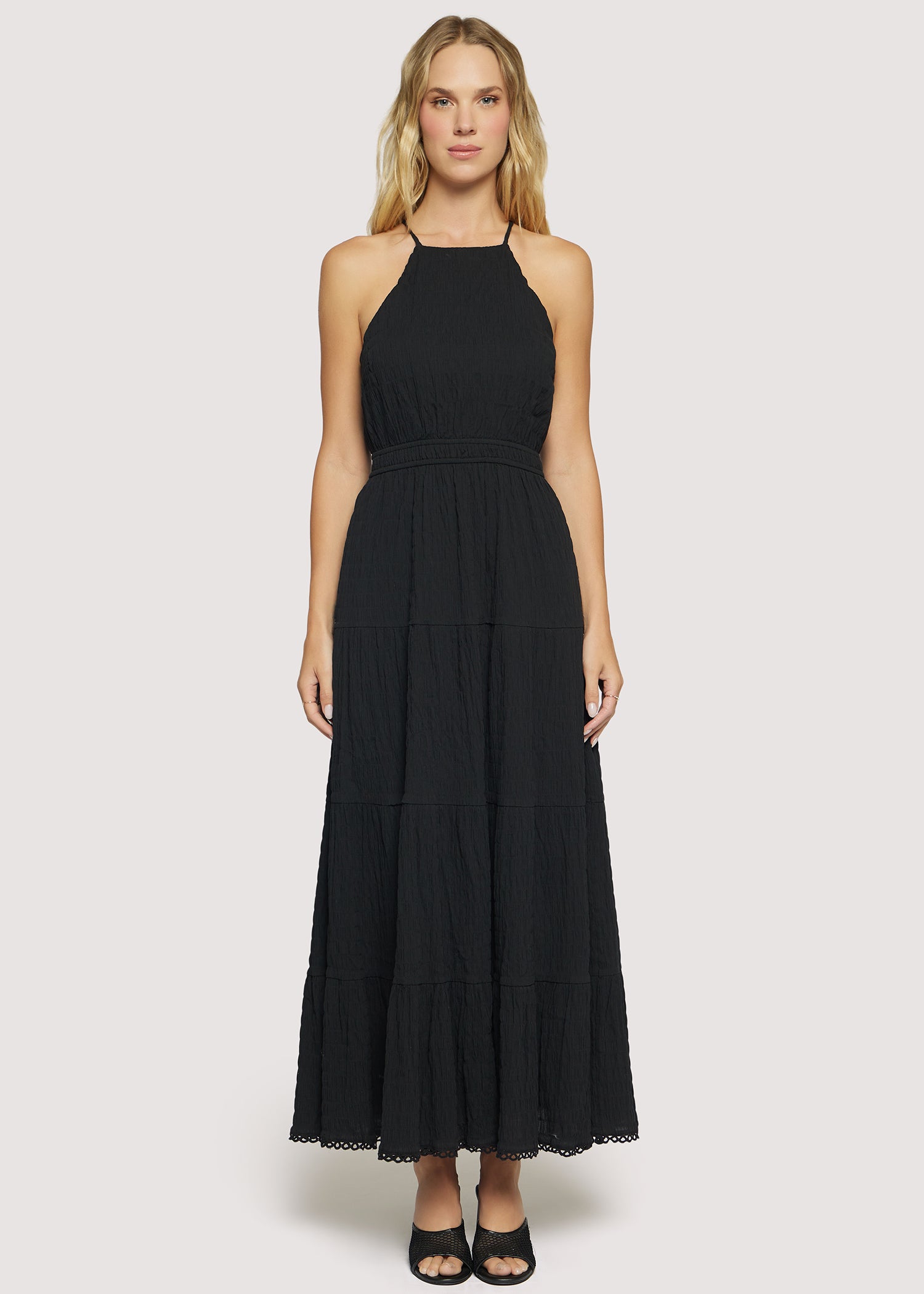 This halter-style maxi dress is effortlessly elegant with its tiered silhouette and subtle textured finish, perfect for warm-weather occasions.
