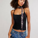 A slinky little top with subtle ruched details, a pullover construction, and a criss-cross back. Soft jersey material make this little nothing something special. Wear it alone for a night out or layered.