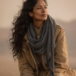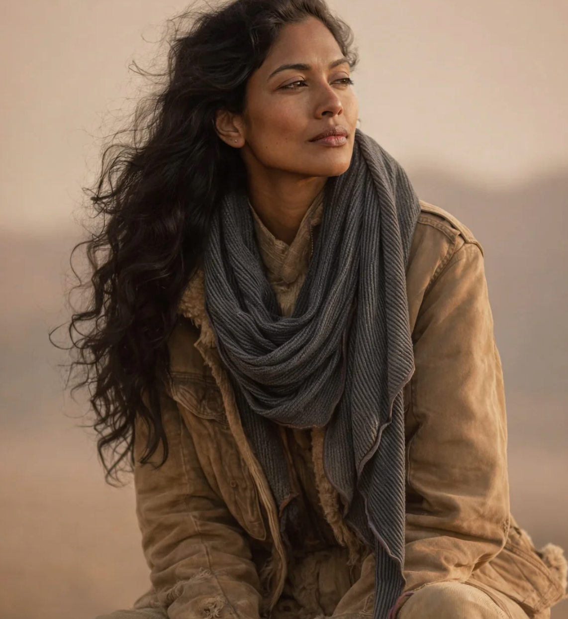 This scarf is designed for individuals who embrace adventure, bold choices, and a unique sense of style. Crafted from soft, large ribbed modal fabric, this scarf combines comfort with a statement-making aesthetic. Its deep charcoal hue makes it versatile while adding a modern edge, perfect for layering over coats, jackets, or casual outfits.