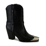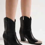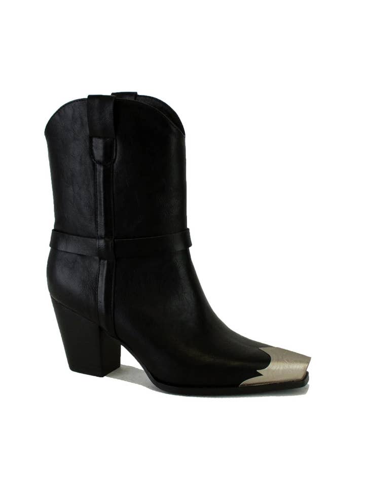 A fresh twist on the classic cowboy silhouette, these ankle booties feature a metallic silver toe cap for a bold pop of shine. Designed in smooth faux leather with a mid-height shaft and stacked block heel, they strike the perfect balance of Western edge and everyday wearability.
