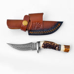 Crafted for both beauty and performance, this hand-forged Damascus steel utility knife blends rugged functionality with heirloom-quality craftsmanship. The genuine stag horn handle and distinctive Damascus pattern make it a striking piece for collectors and everyday use alike.
