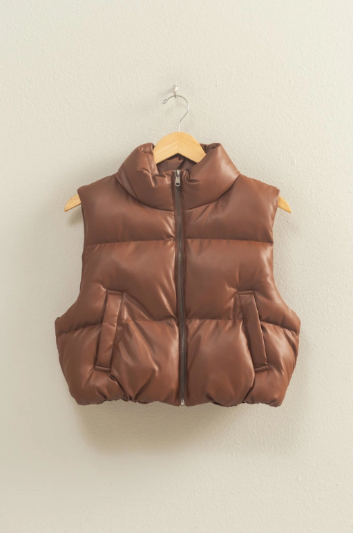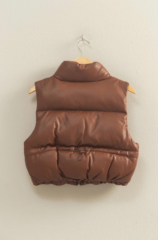 This structured puffer vest, made out of faux leather in the best colors of the season, is exactly the extra outer piece you've been needing for casual outfits. Layer in style with the adjustable drawstring waist and high necked collar, perfect for adding warmth without the bulk!