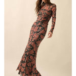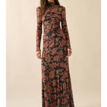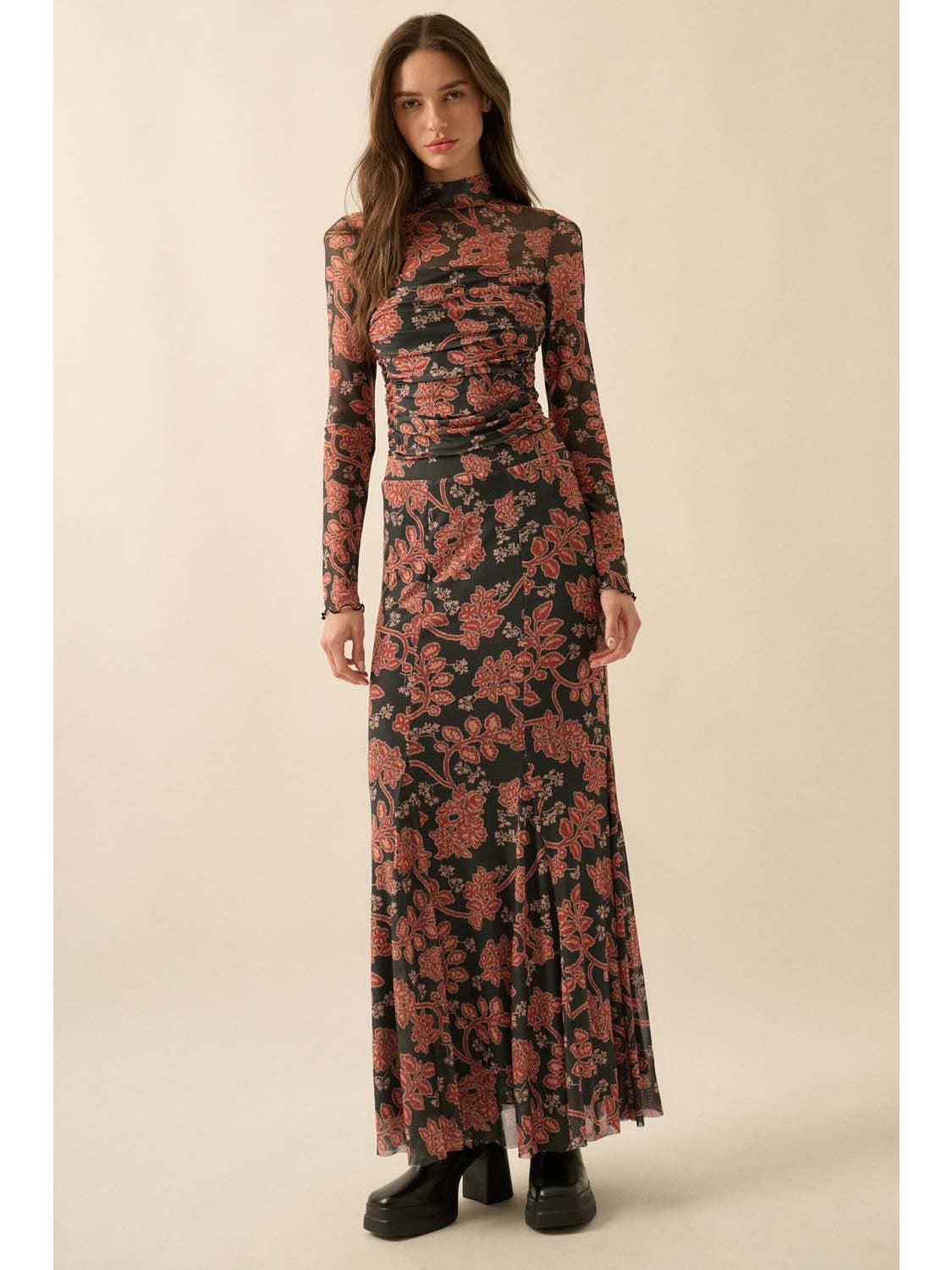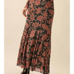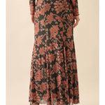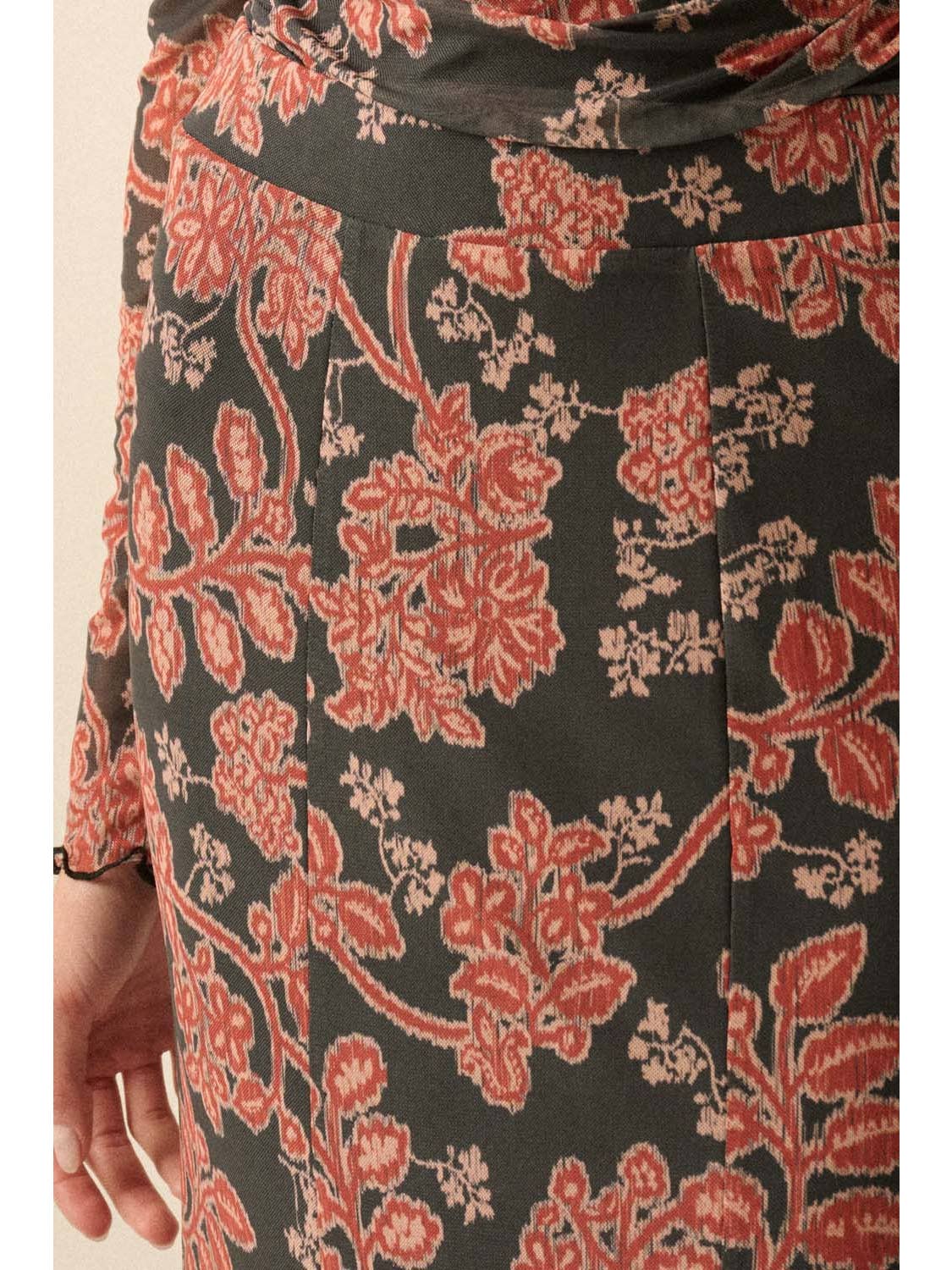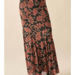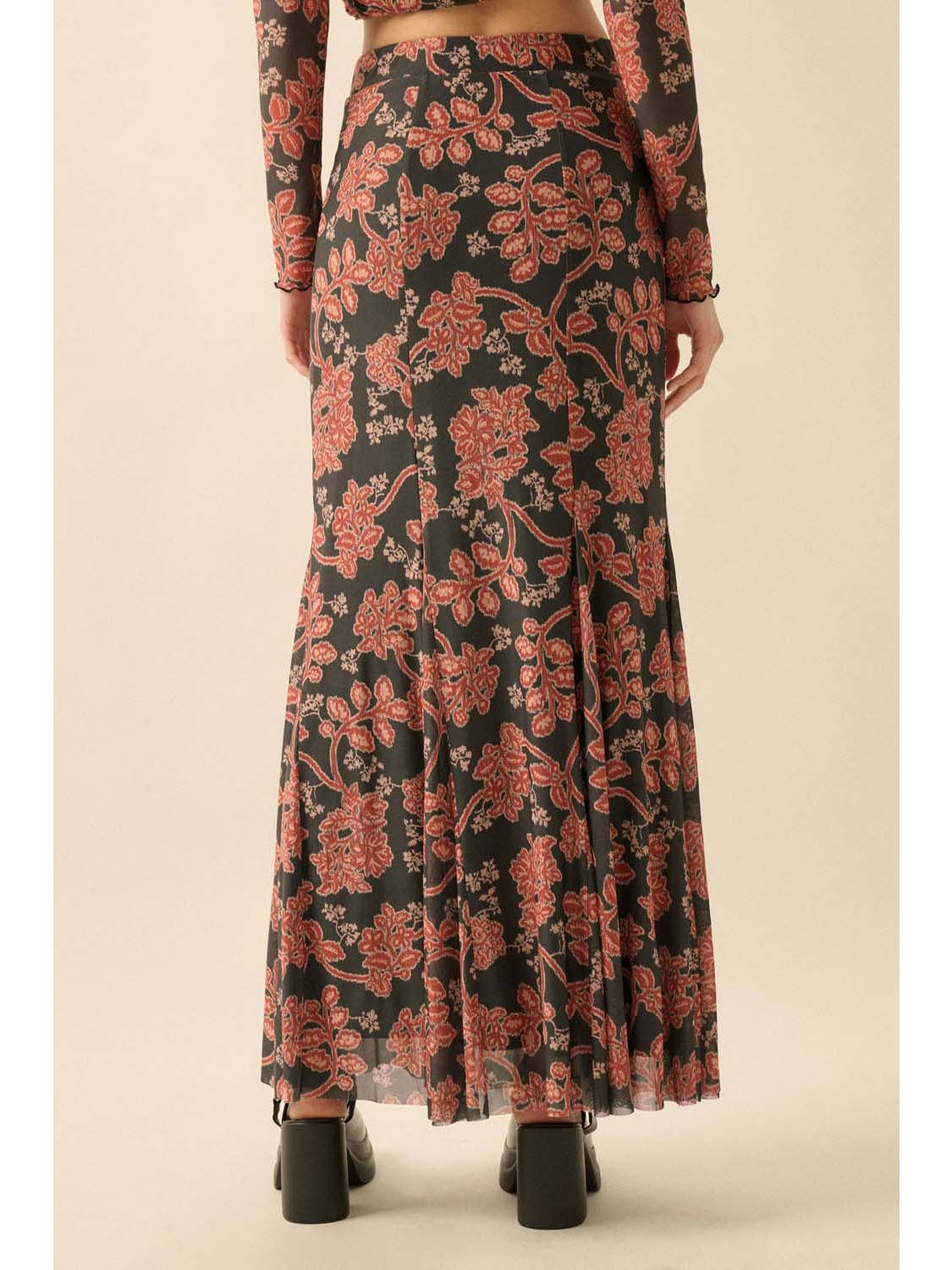 The most drapey, mermaidy skirt, in all-over vining florals of a rich red and deep blue gray, is ready to twirl its way into your daily outfits. Keep the look clean and modern with a sleek minimal turtleneck, boxy cropped vest, and clean lined boots, or go full Stevie and layer it with lace and a shining belt (or two).