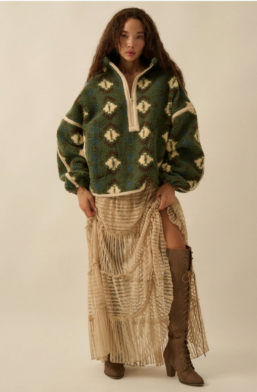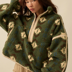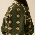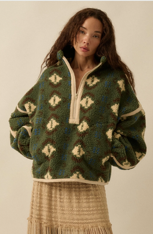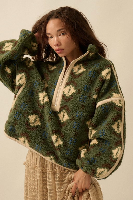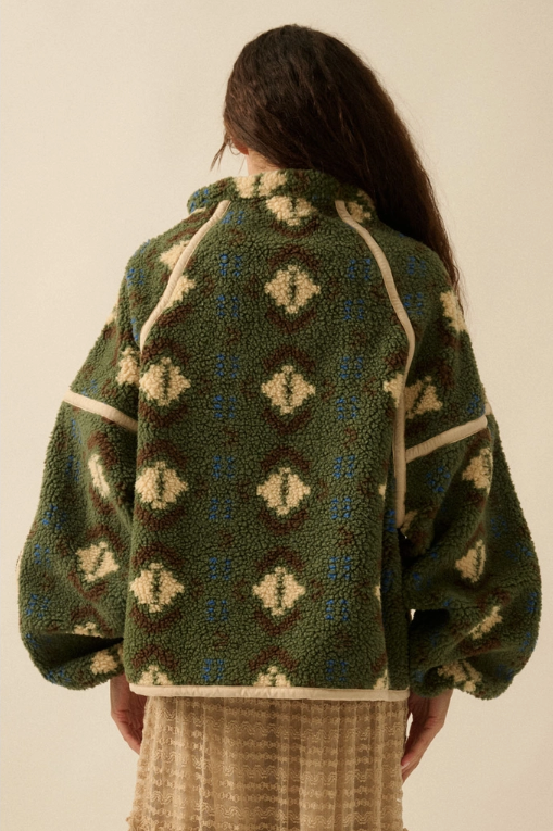 Geo-Print Sherpa Fleece Half-Zip Pullover Jacket - Green Combo