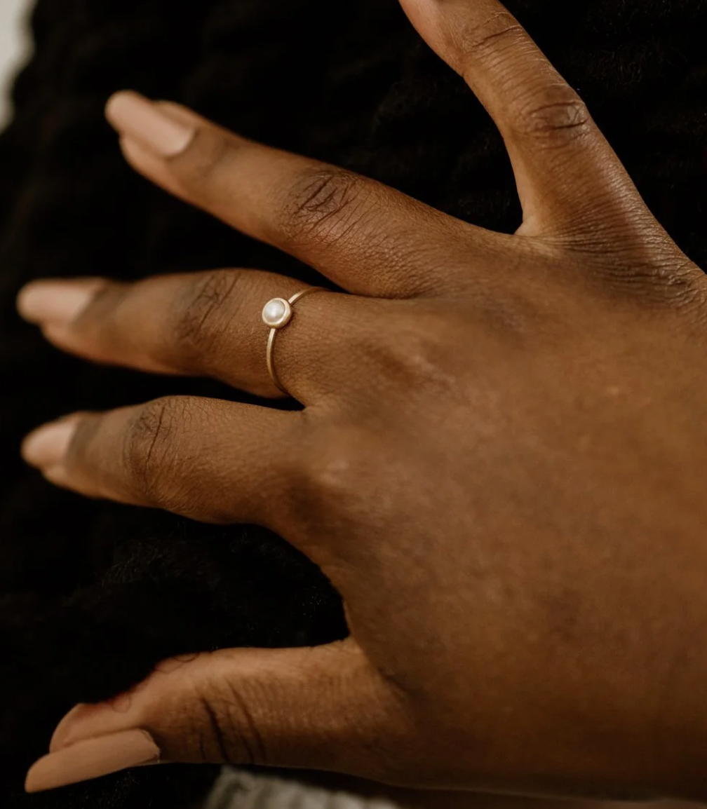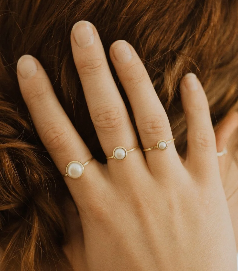 A solid brass band with 4mm bezel set freshwater pearl in size 5.5. This is the smallest of the three in the image, great for pinky fingers or dainty hands!