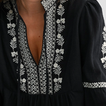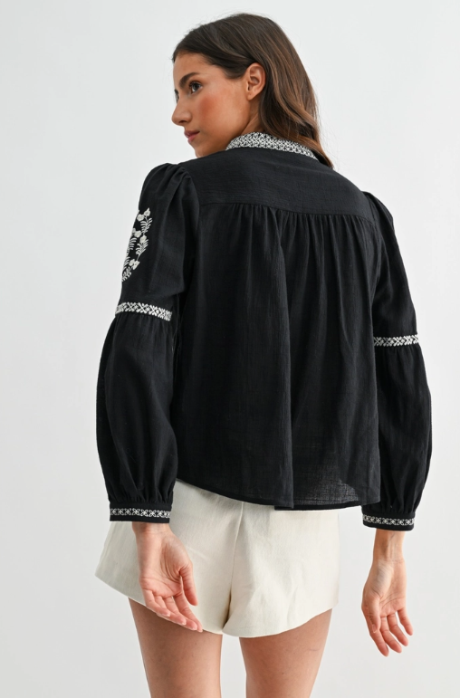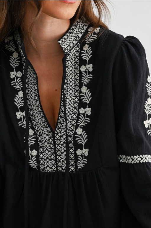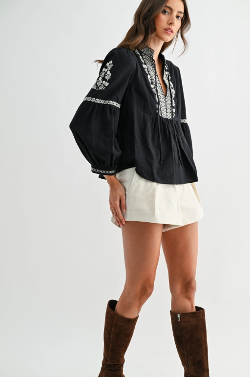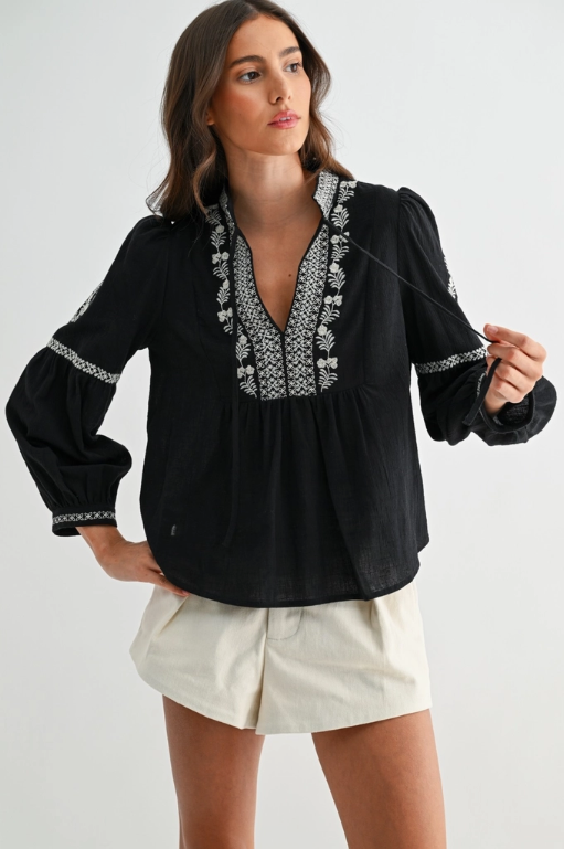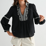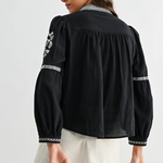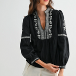 Black Embroidered Boho V-Neck Blouse - Black
