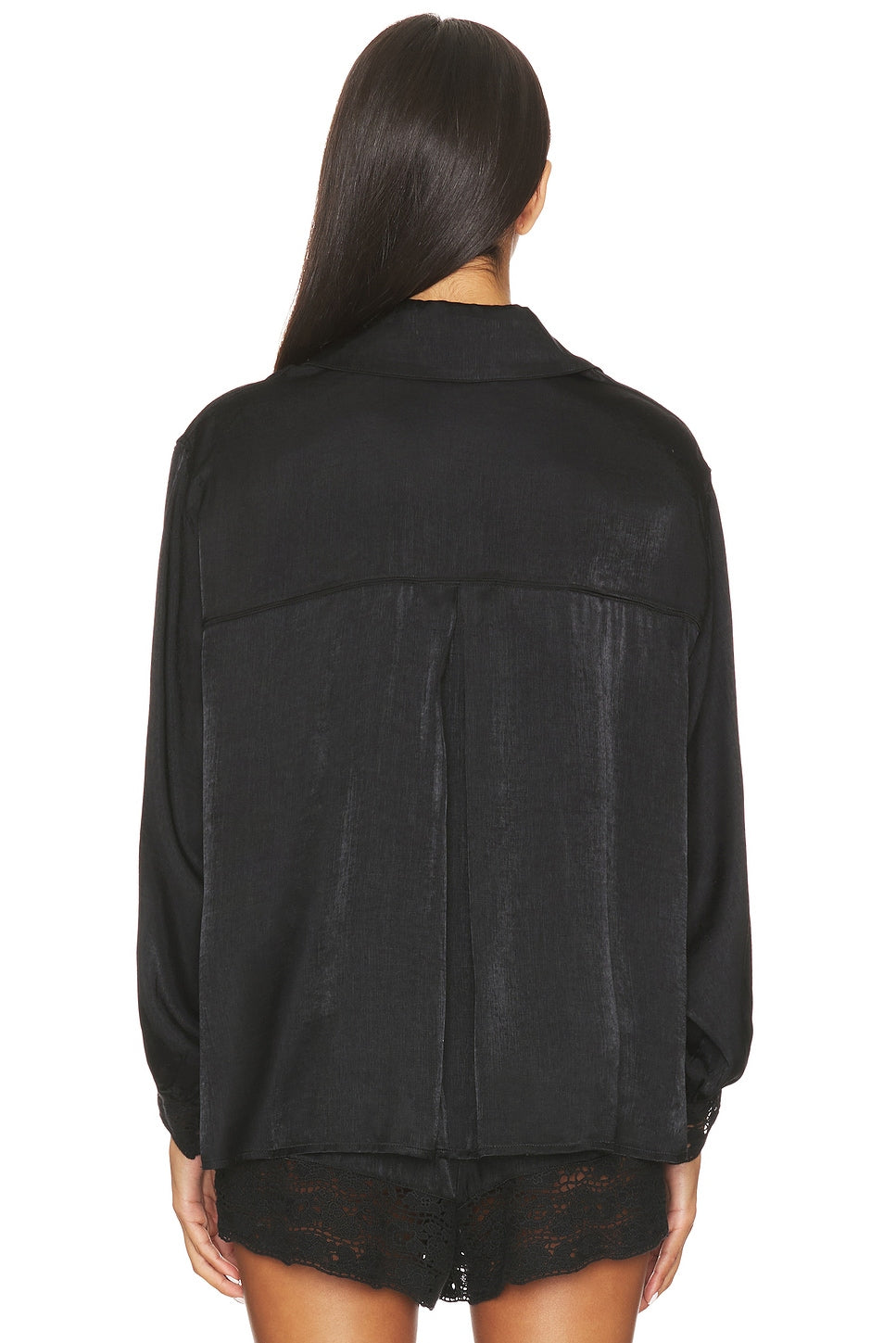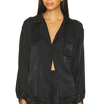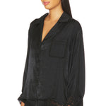 Crochet-inspired cuffs add a pretty boho touch to this silky, slouchy shirt that you will not want to keep hidden in the boudoir. The relaxed fit and button-front style with lace trim create a perfect femme finish for nights out with friends.