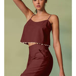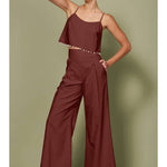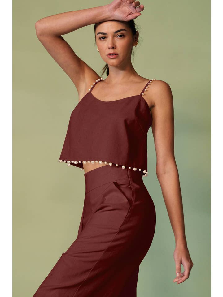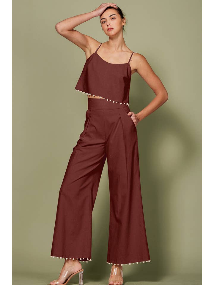 Sophistication meets comfort in these elegant high-waisted trousers, featuring a refined pearl trim at the hem. The tailored wide-leg silhouette elongates the legs while ensuring effortless movement — perfect for both elevated and polished-casual looks.