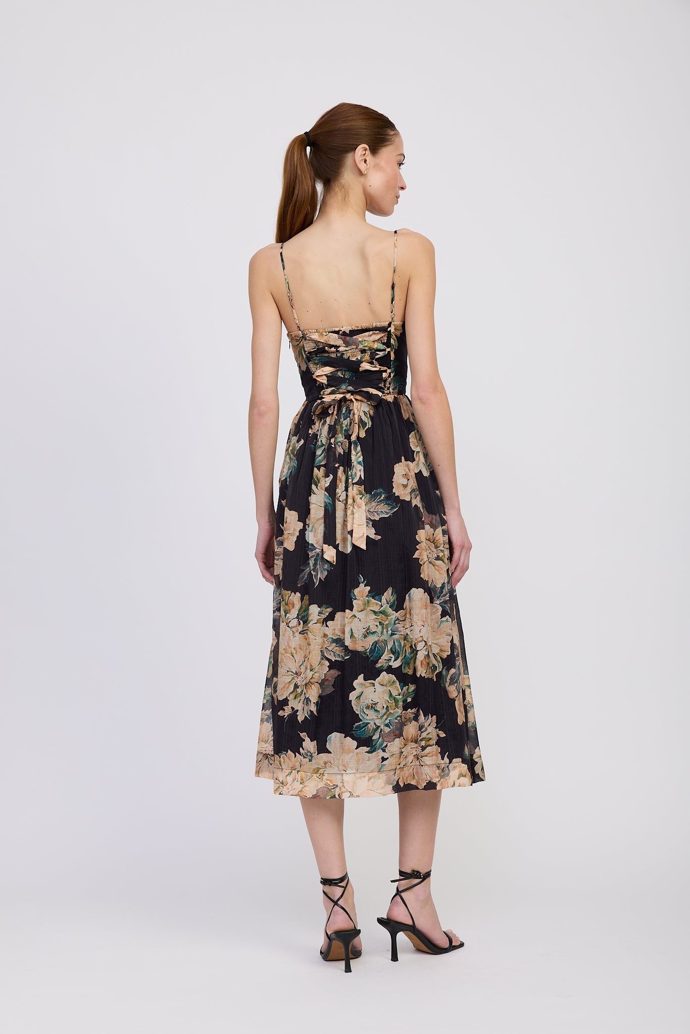 Feminine and flattering, this midi dress features a structured corset-style bodice with an elegant tie-back detail. Its smooth, body-skimming fabric and subtle sheen make it perfect for both special occasions and nights out.