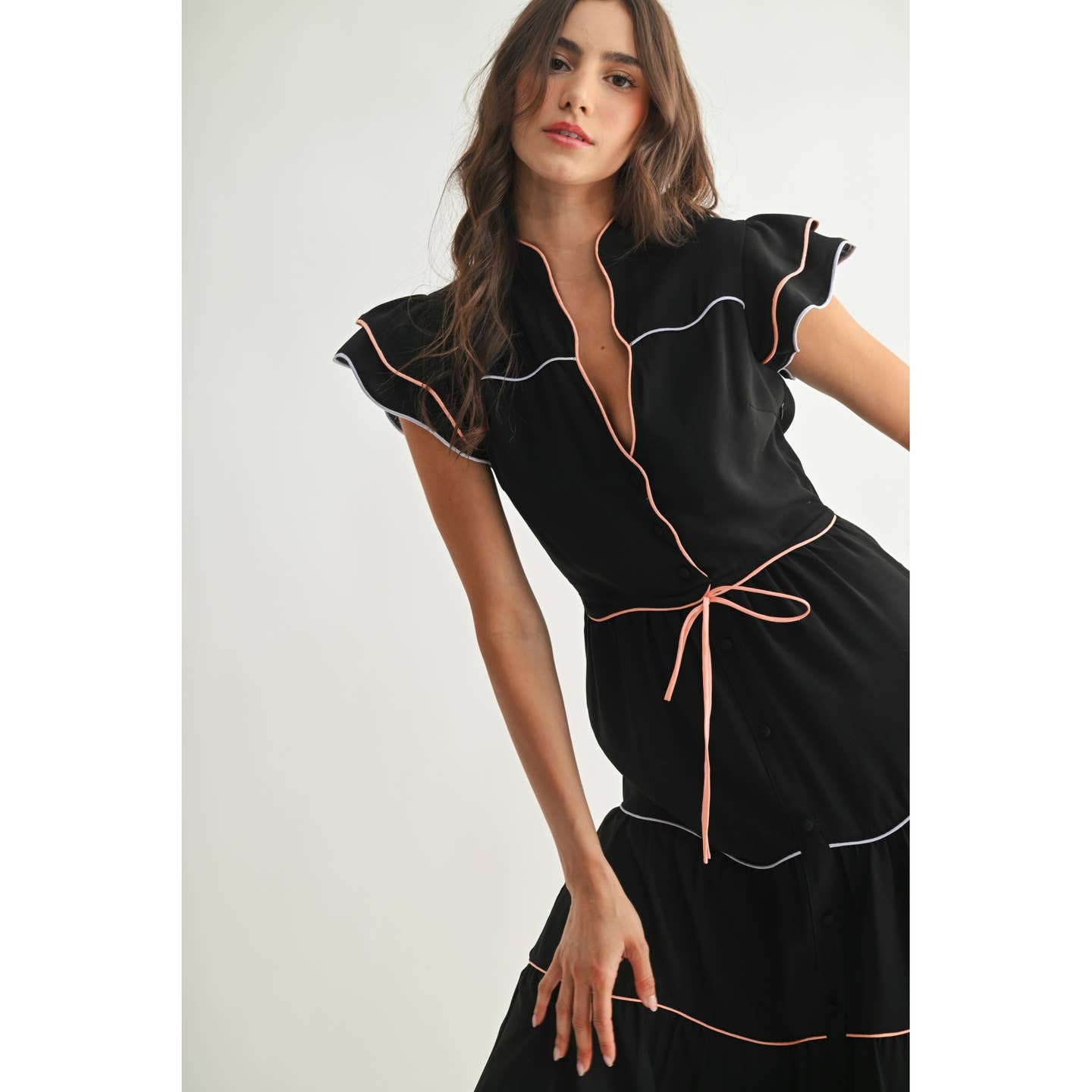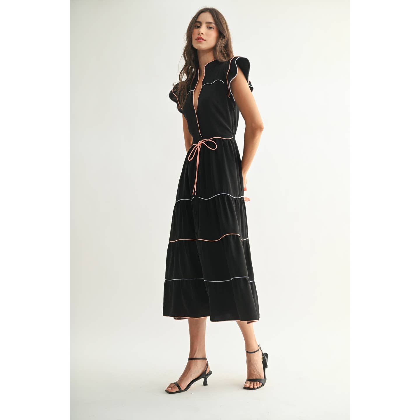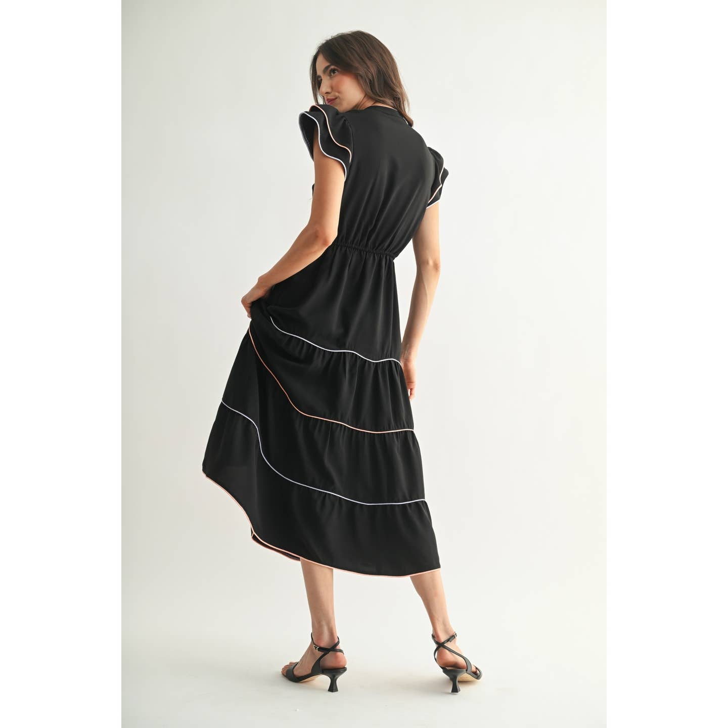 This black tiered maxi dress integrates elegance with functional design, ideal for any celebration event. Its unique detailing, accentuated v-neckline and refined silhouette will turn heads.