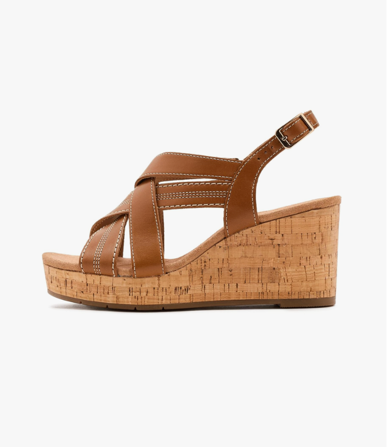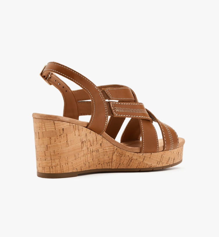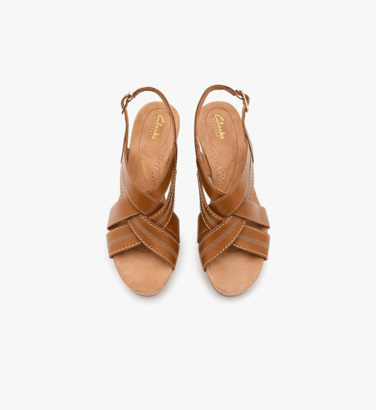 Clarks® Sabina Sling sculpted cork wedge elevates your look with just the right stability. The sandals feature premium tan leather upper for a soft feel and lasting wear, with an adjustable slingback strap that offers a secure, personalized fit. Molded Contour Cushion™ footbed delivers lasting comfort while the dual-density black polyurethane midsole provides lightweight and flexibility.