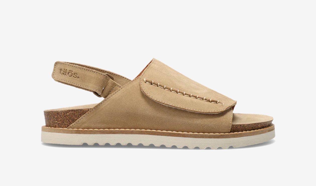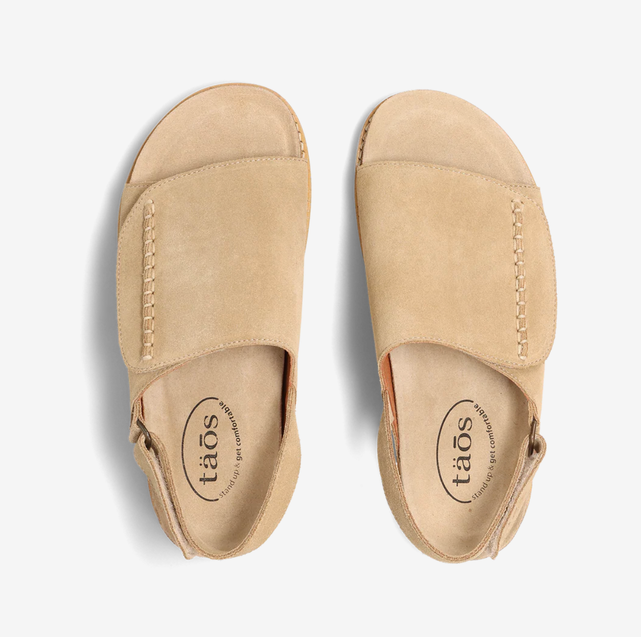 A luxe blend of modern boho style and unbeatable comfort. Made in Portugal with soft European suede, the Abstract sandal from Taos offers generous forefoot coverage with an adjustable strap and detailed contrast stitching for artisanal appeal. A fully adjustable back strap ensures a secure fit. Our signature supportive PU footbed, lined with premium suede and paired with a cork midsole, delivers exceptional cushioning and arch support. For the woman who demands all-day comfort without compromising on must-have fashion.
