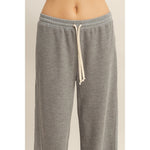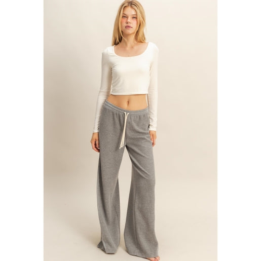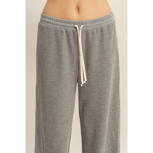 Upgrade your everyday lineup with these waffled knit pants, delivering the perfect blend of comfort, drape, and effortless style. Finished with a relaxed silhouette and a bold white contrast drawstring, they offer a flattering fit that moves with you from lounging to laid-back outings.
