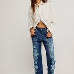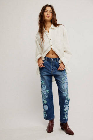 The willow Embroidered Floral Jeans are like a walk through a secret garden. astonishing tonal blue and green flowering vines are embroidered all up and down the sides and back pocket detail, creating a rich tapestry of flowers that looks as special and handcrafted as it is. Straight leg and mid rise, these jeans can be worn slouchy or higher, and pair well with boots, flats, and any show that needs a higher ankle length.